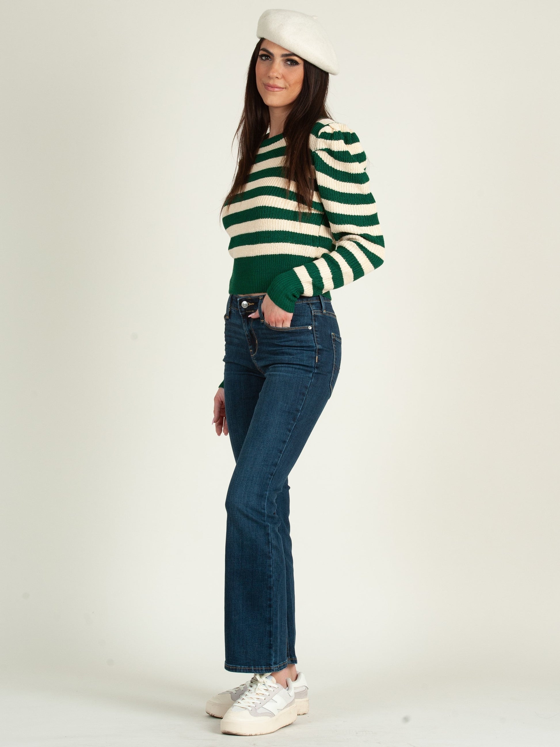 Flattering puff shoulder sweater top! Wear on its own with classic denim or pair w/ overalls for a streetstyle inspired look!