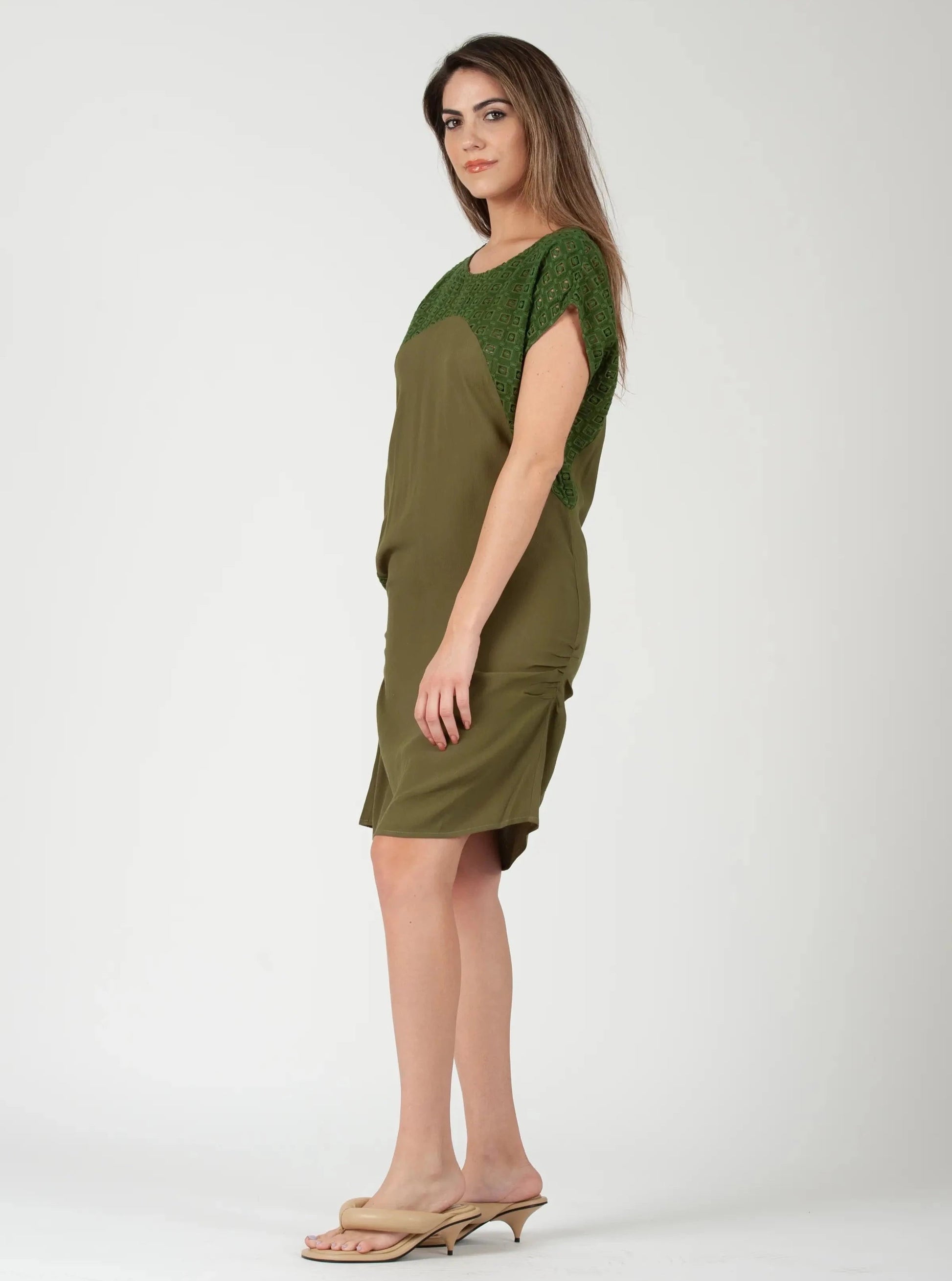 Boho crochet short sleeve dress featuring inset panel and a ruched hem! Flattering, chic take on a shirtdress. Perfect for all year round looks and traveling summers!