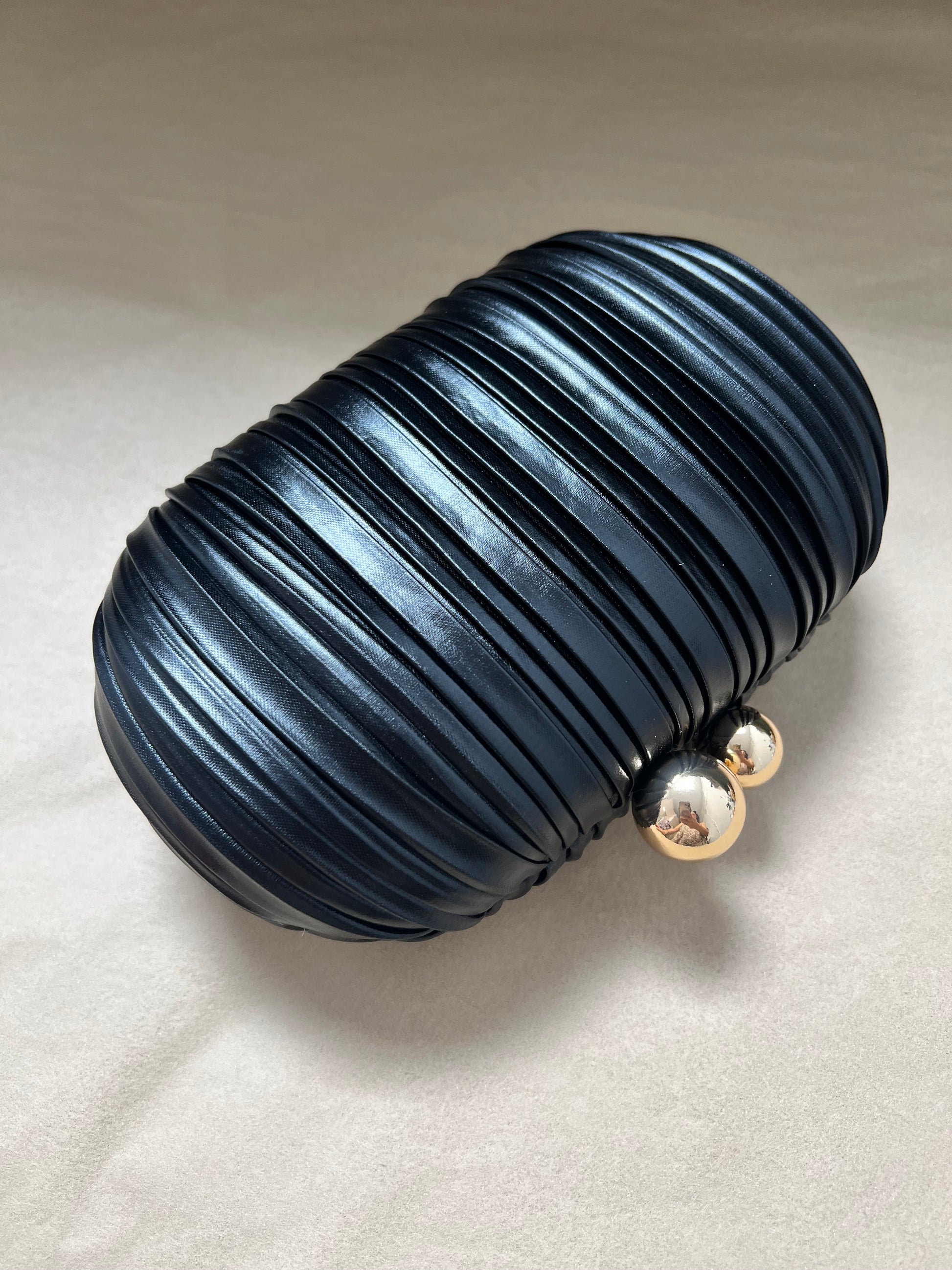 This Stunning bag is perfect for evenings out, with Pleated Fabric and Metallic Gold ball closure details, included chain straps to wear how you like.