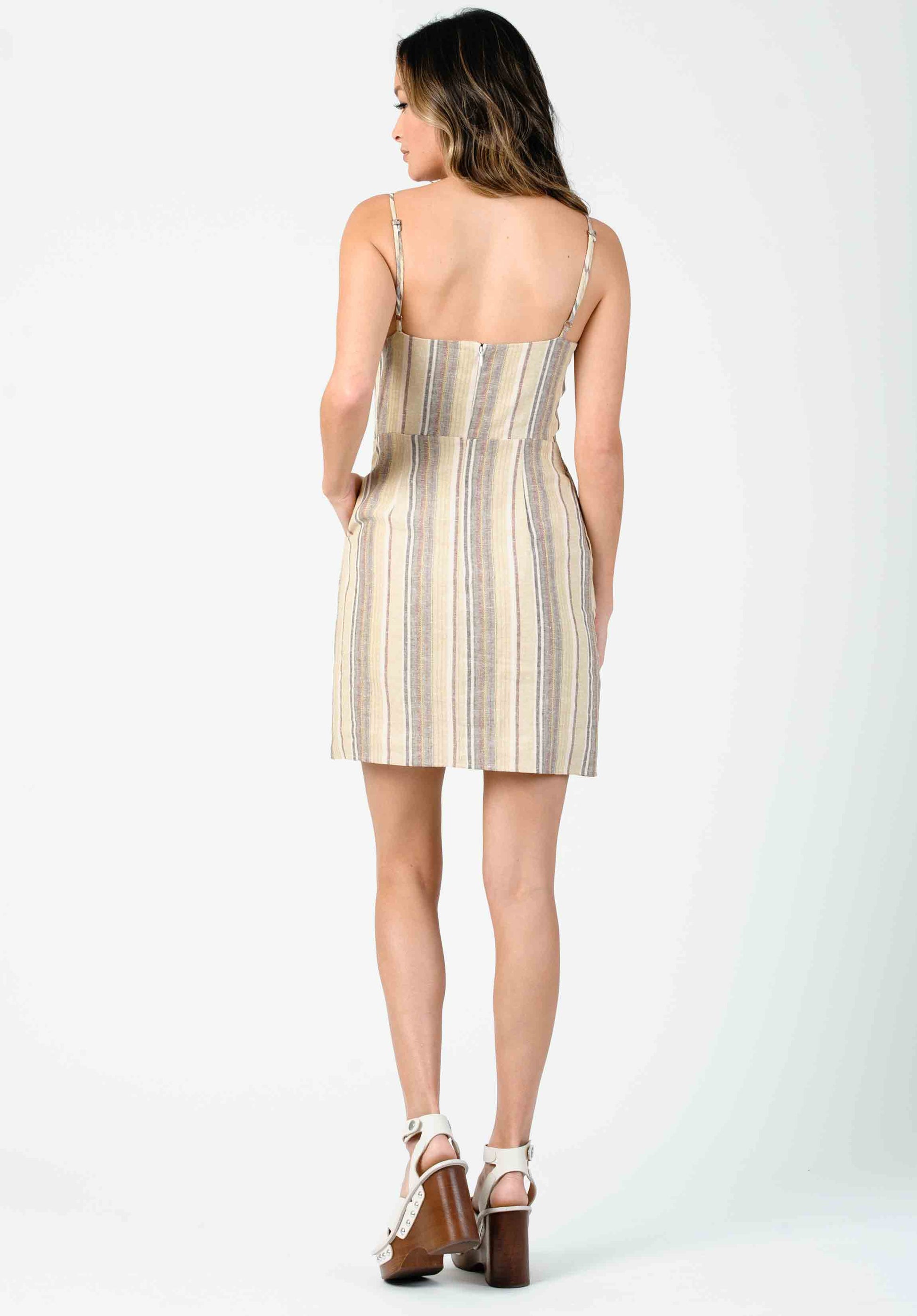 Mini Dress with Square Neck & Spaghetti Straps. Neutral desert color stripes in linen fabrication. Perfect for the hot weather to come!