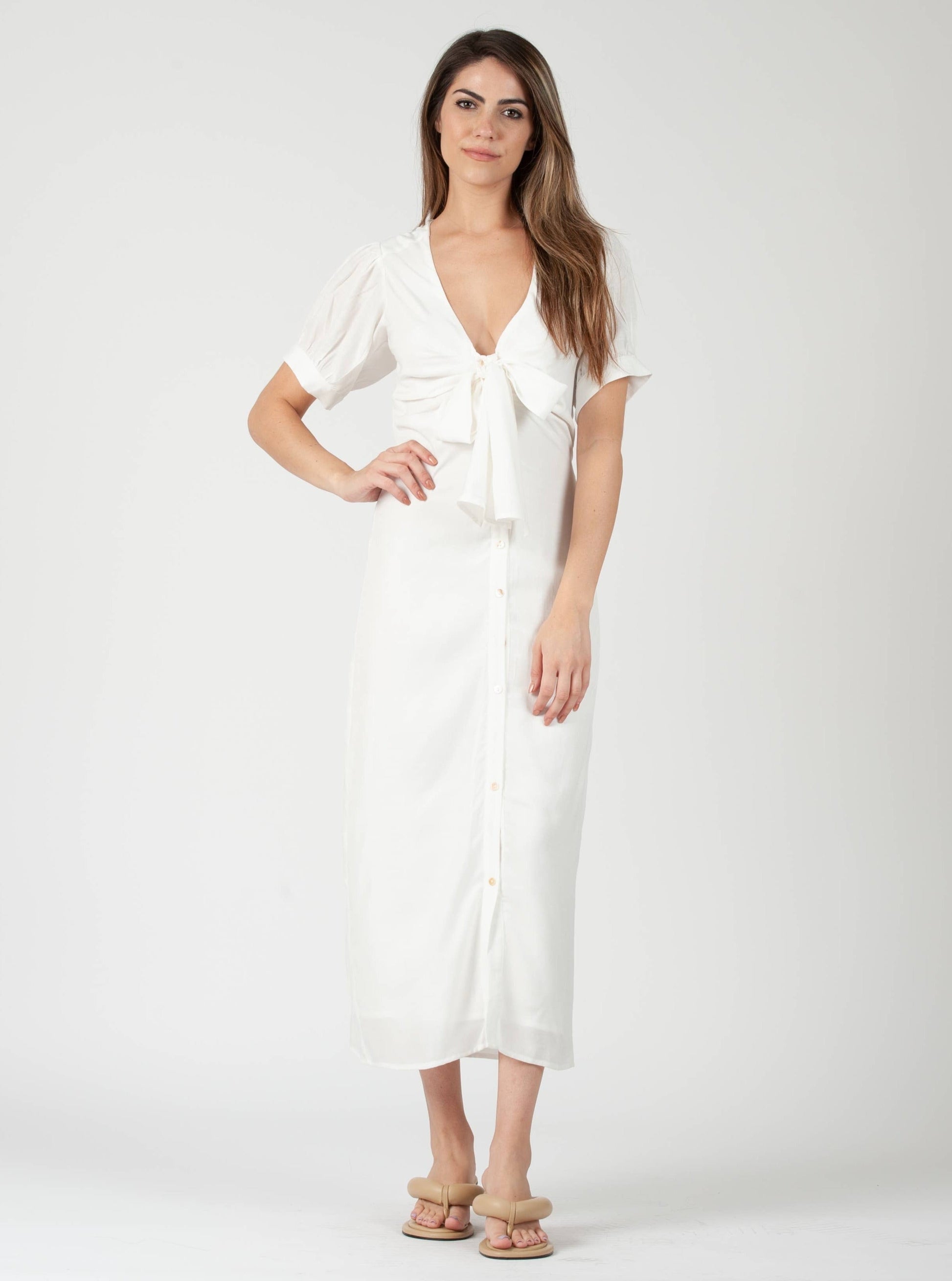 Silky rayon button down short sleeve dress with front bow tie detail. Get into the bow trend with this feminine chic dress!
