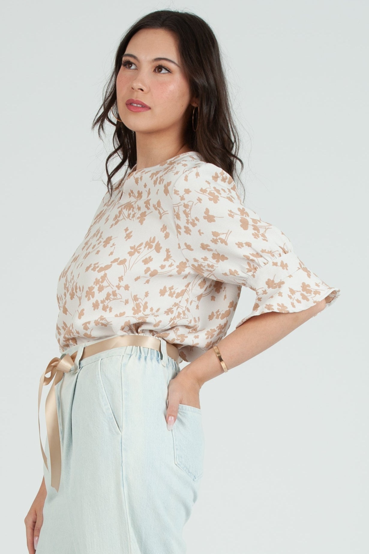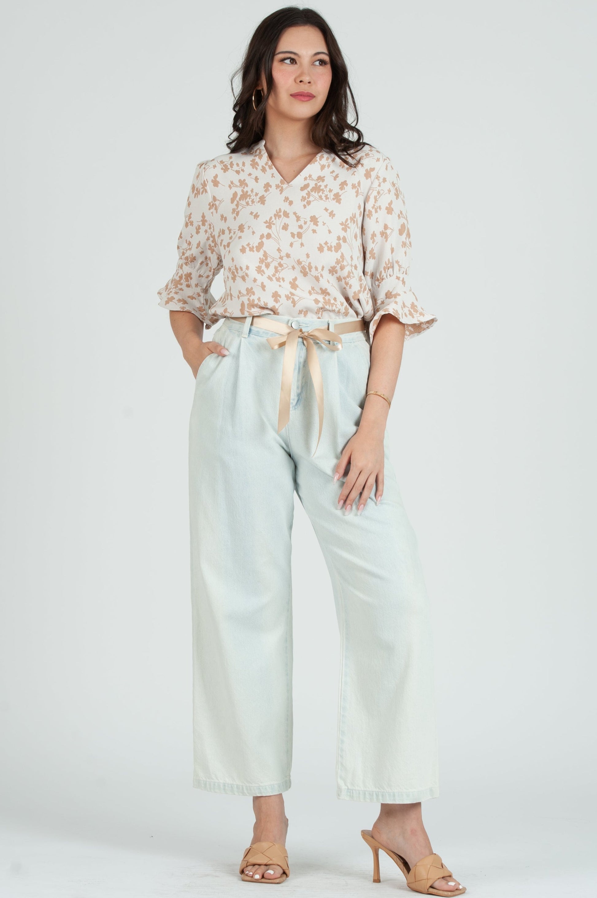 This floral blouse boasts a unique 2 tone print and a flounce ruffle hem sleeve for a feminine touch. Perfect for any occasion from desk to dinner. Coordinate with our Denim Pants or your favorite skirt.