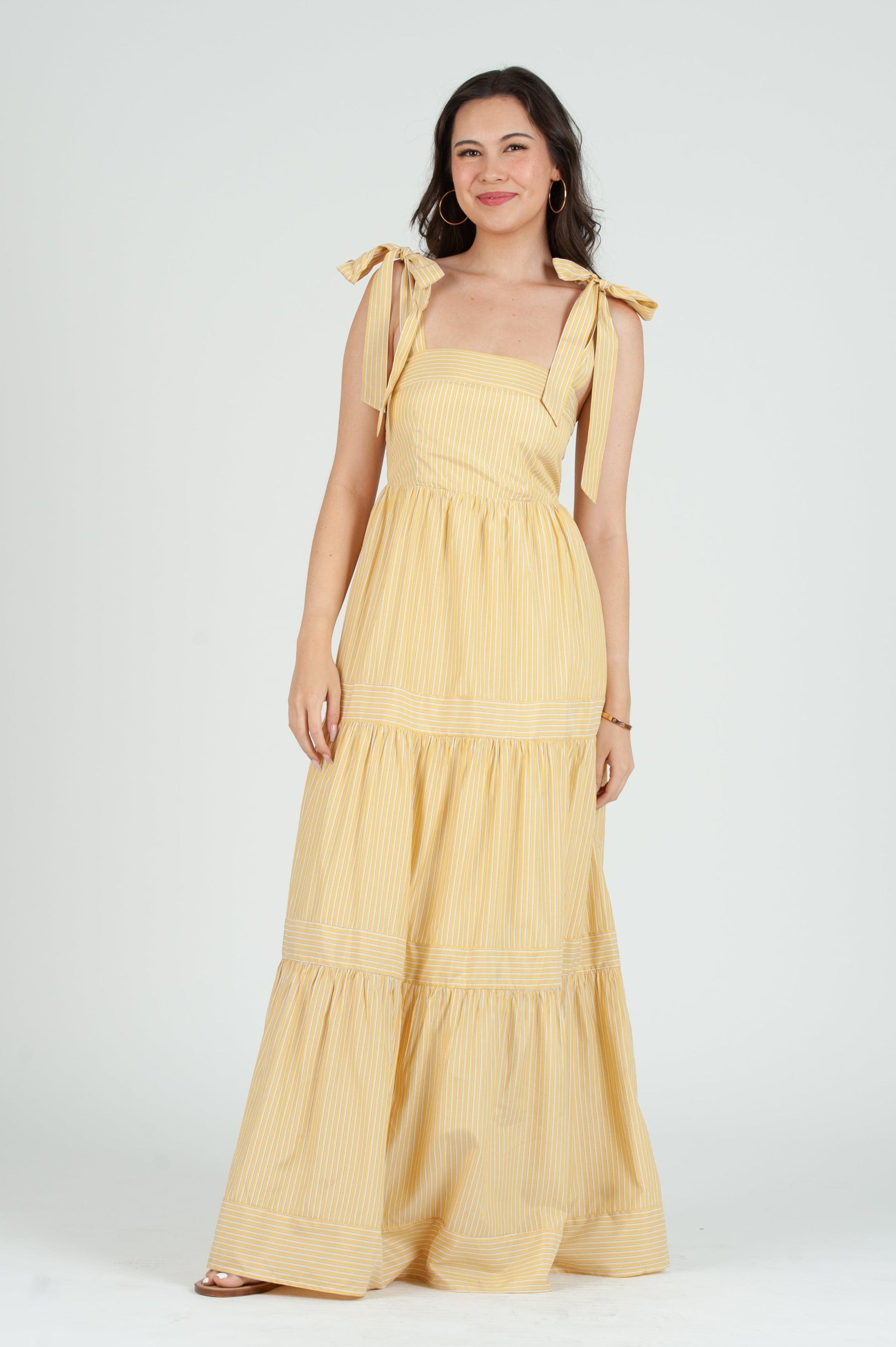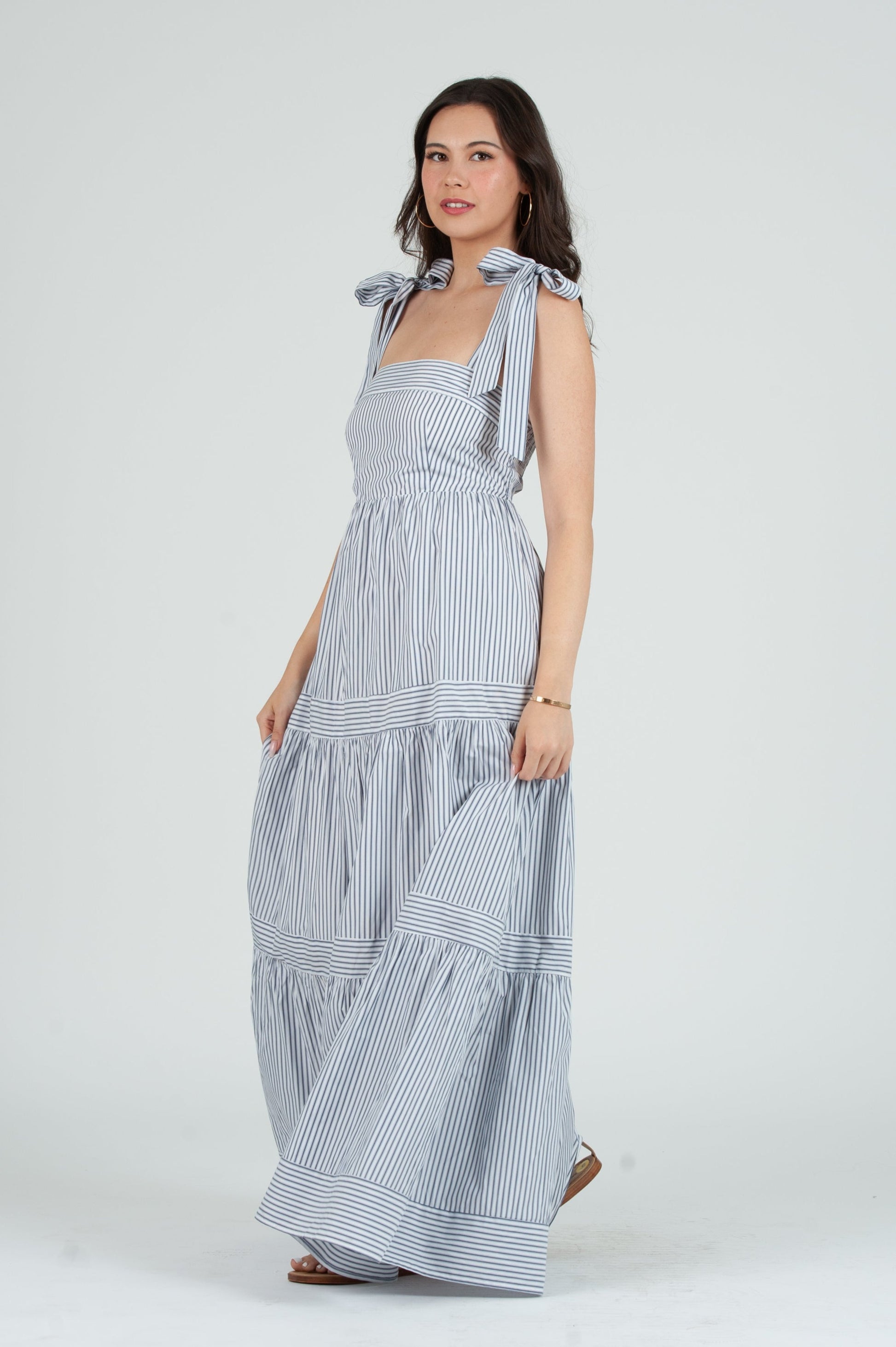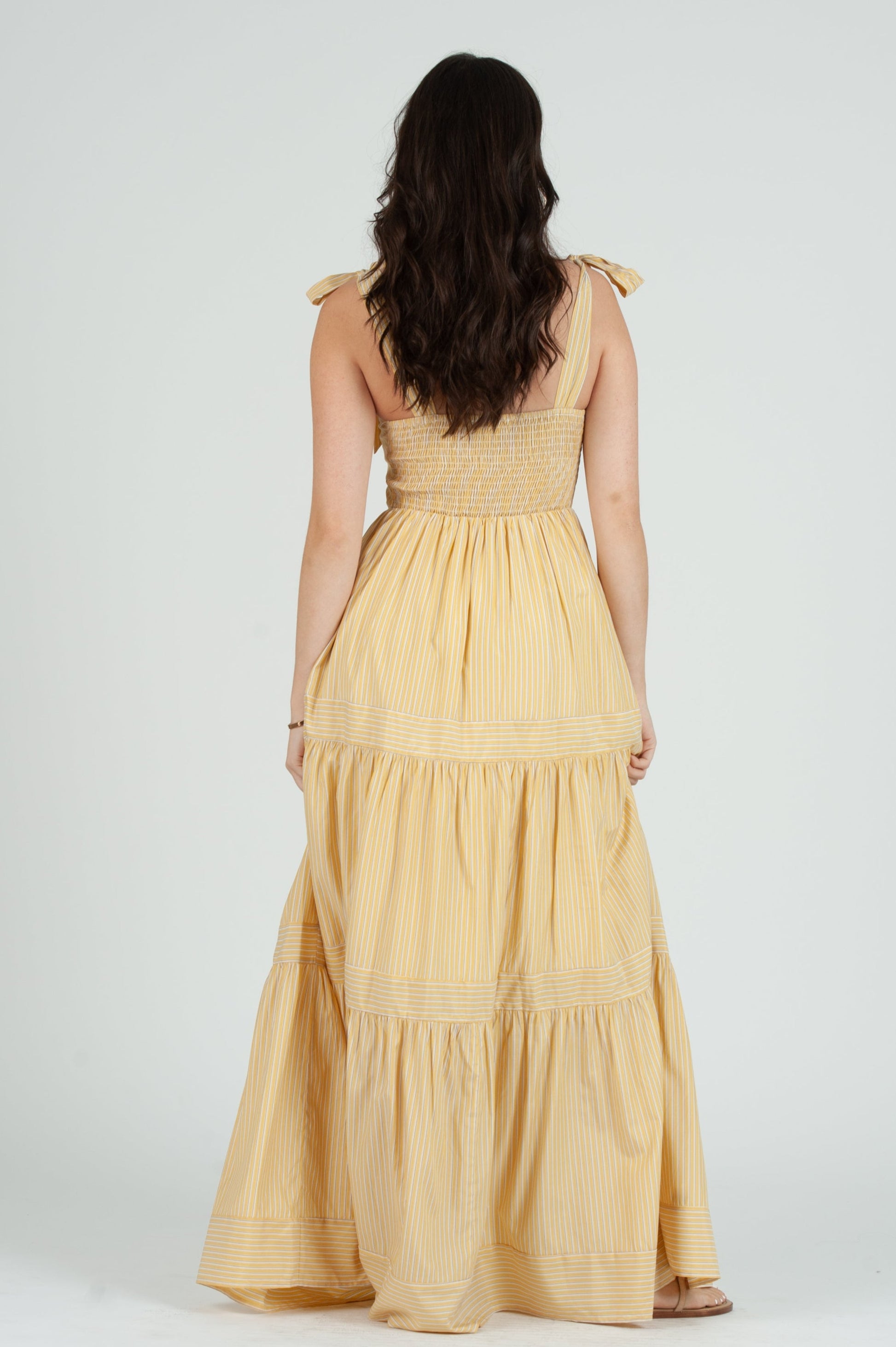 Introducing our best-selling Striped Maxi Tier Dress! Made from our exclusive new yarn dye stripe fabric, this dress is sure to make a statement. Its flattering tiered design and bold stripes will have you turning heads and feeling confident. A must-have for any fashion-forward wardrobe.