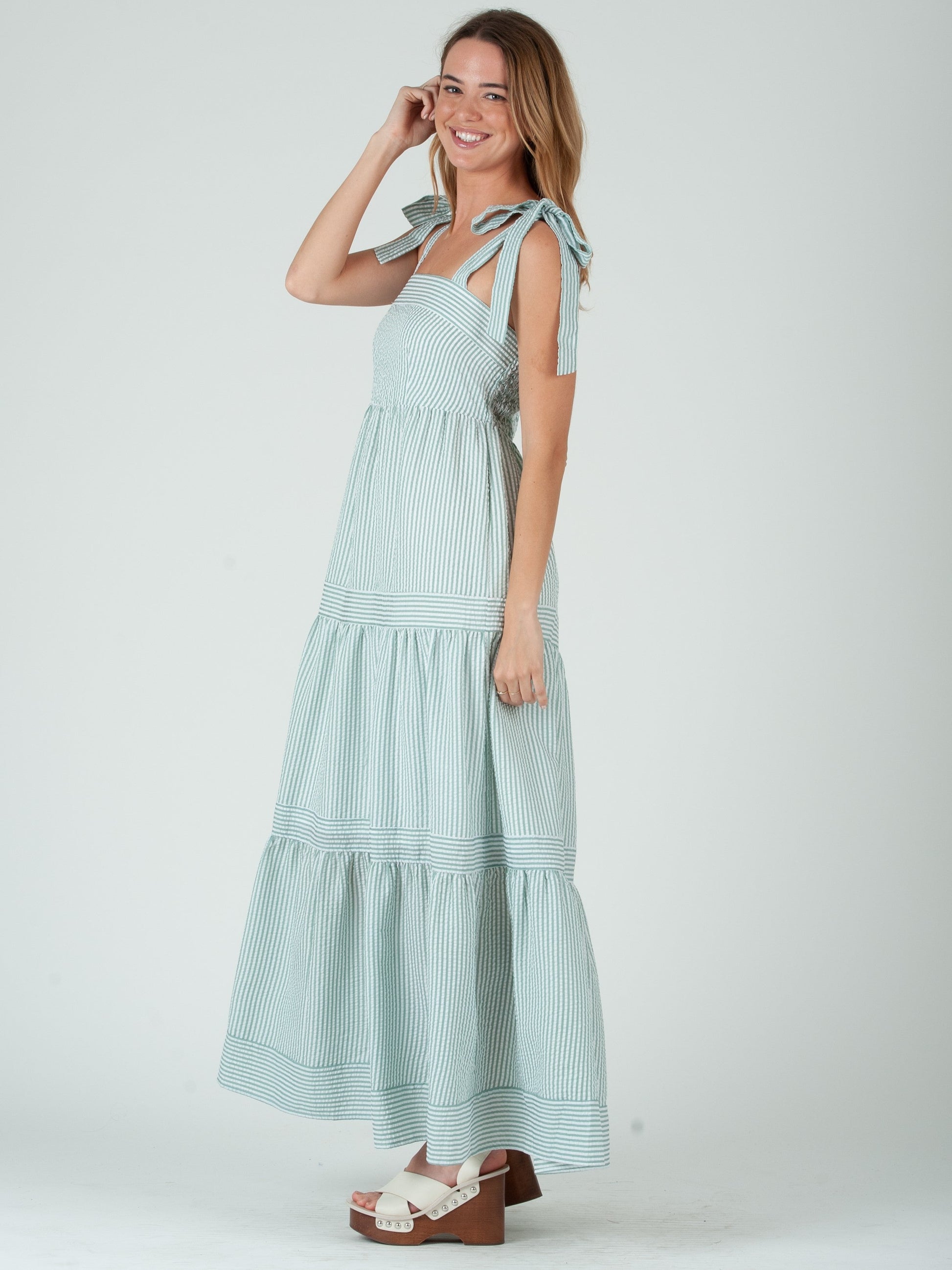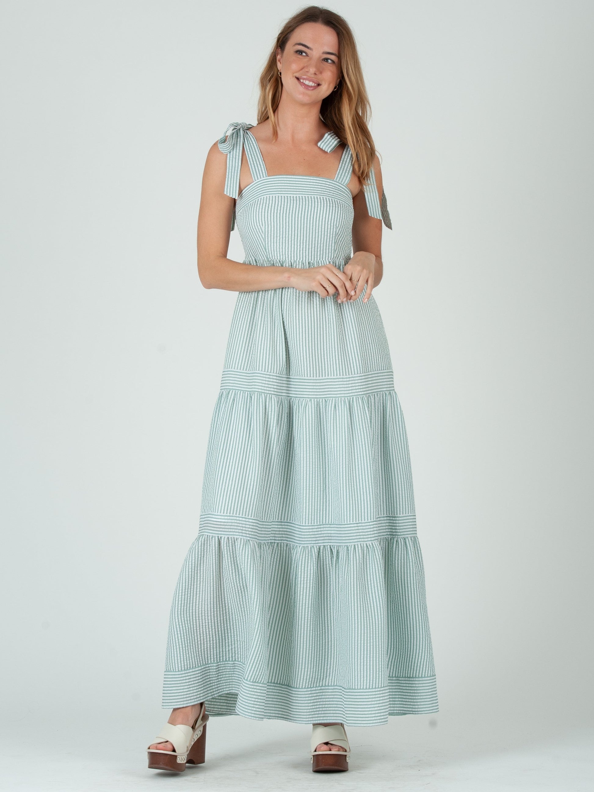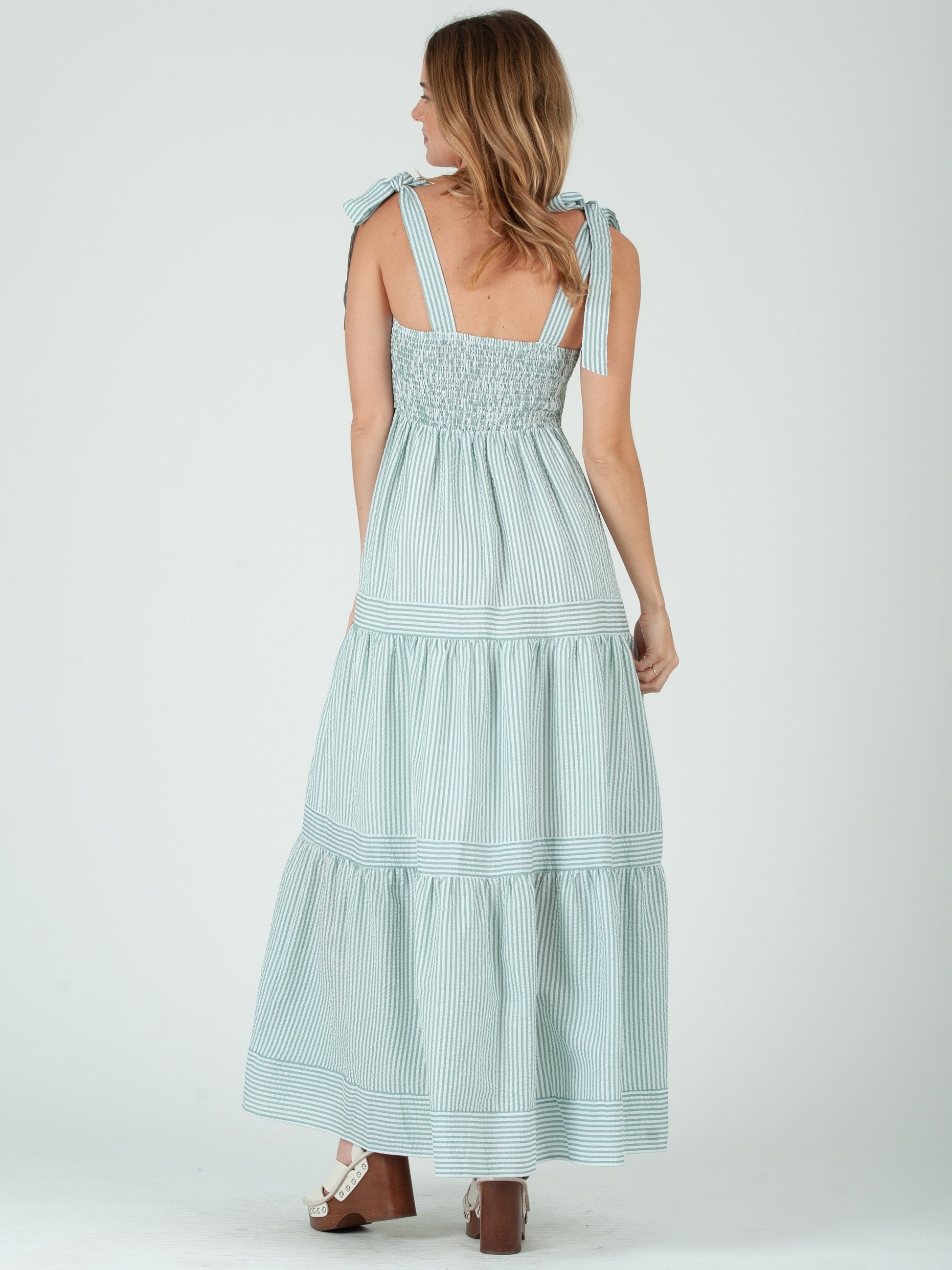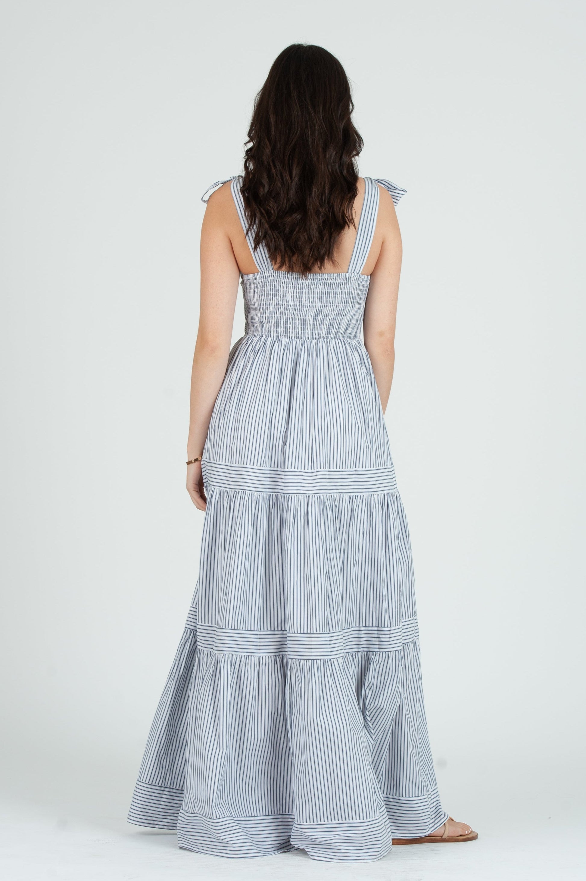 Introducing our best-selling Striped Maxi Tier Dress! Made from our exclusive new yarn dye stripe fabric, this dress is sure to make a statement. Its flattering tiered design and bold stripes will have you turning heads and feeling confident. A must-have for any fashion-forward wardrobe.